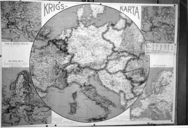 Fotografi av "Krigs-karta". En något rektangulär kart med fyra olika skala av Europa i hörnen samt en större rund karta i mitten med lägre skala.