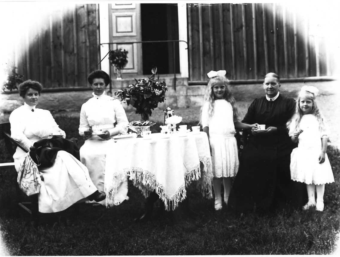 Gruppbild med tre kvinnor och två flickor som sitter och står vid ett dukat kaffebord utomhus framför Missionshuset i Örserum, en rödfärgad byggnad med locklistpanel. Till vänster sitter två kvinnor i ljusa klänningar, det är syskonen Agnes och Tyra Josefsson. Till höger två flickor i ljusa klänningar, långt hår med rosett i håret flankerar en äldre kvinna i mörk klänning som håller en kaffekopp i knät. Flickorna är Agnes döttrar och den äldre kvinnan är mormor Sofie Josefsson.