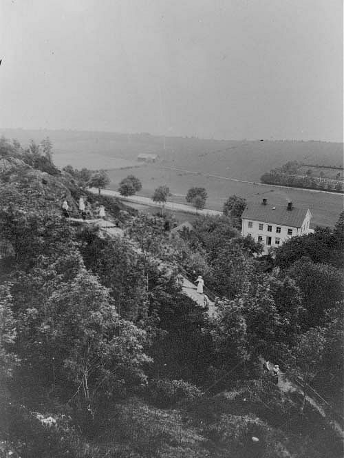Vy från Grännaberget mot kyrkogården och fastigheten Lyckebo. I förgrunden trappan - "Bergstigen" - till Grännaberget. Oidentifierade personer i trappan.