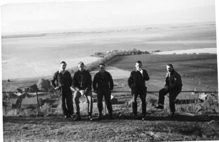 Fem män sitter el står lutade mot ett räcke på Grännaberget vid friluftsmuseet. Nedanför dem syns Hamnallén och hamnen.