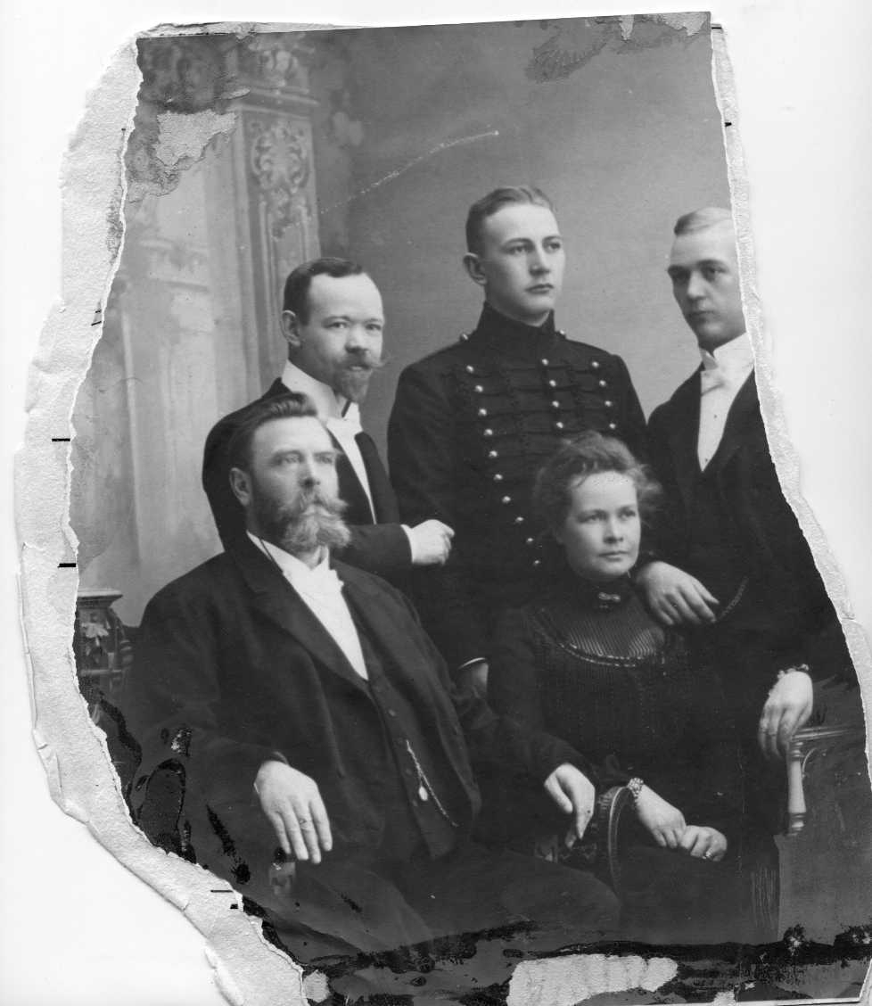 Trasigt fotografi med fyra män och en kvinna, en familjegrupp.