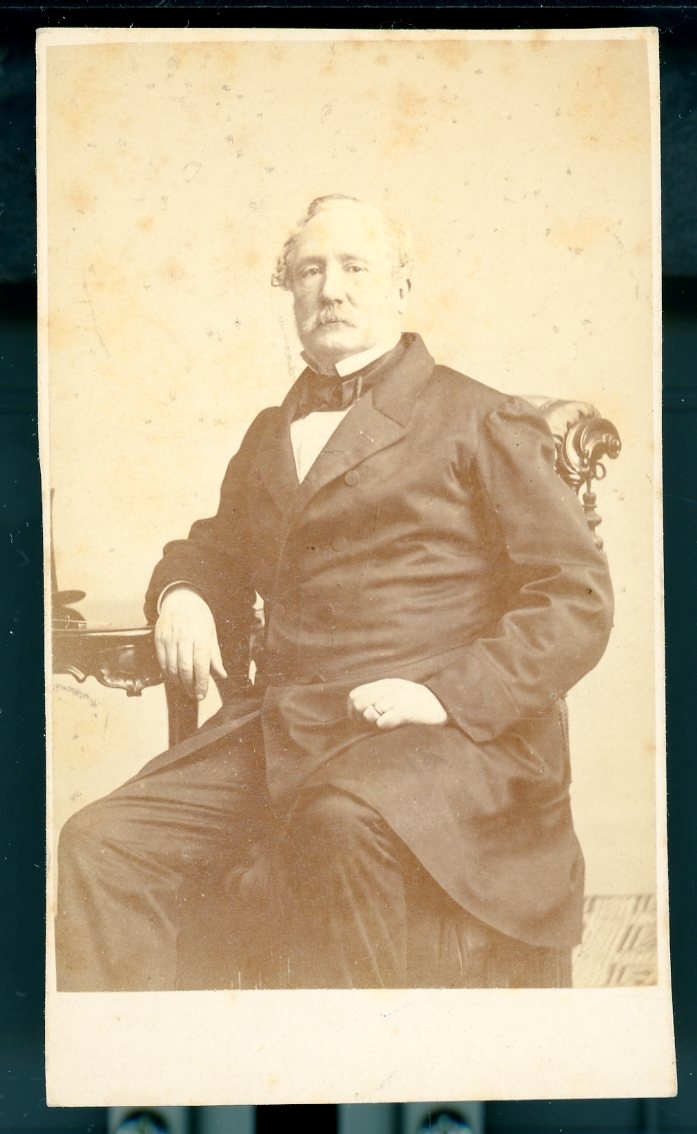 Kabinettsfotografi: Nils Fredrik Hjertström i rock och kravatt sittande i en stol med högerarmen vilande på ett bord.