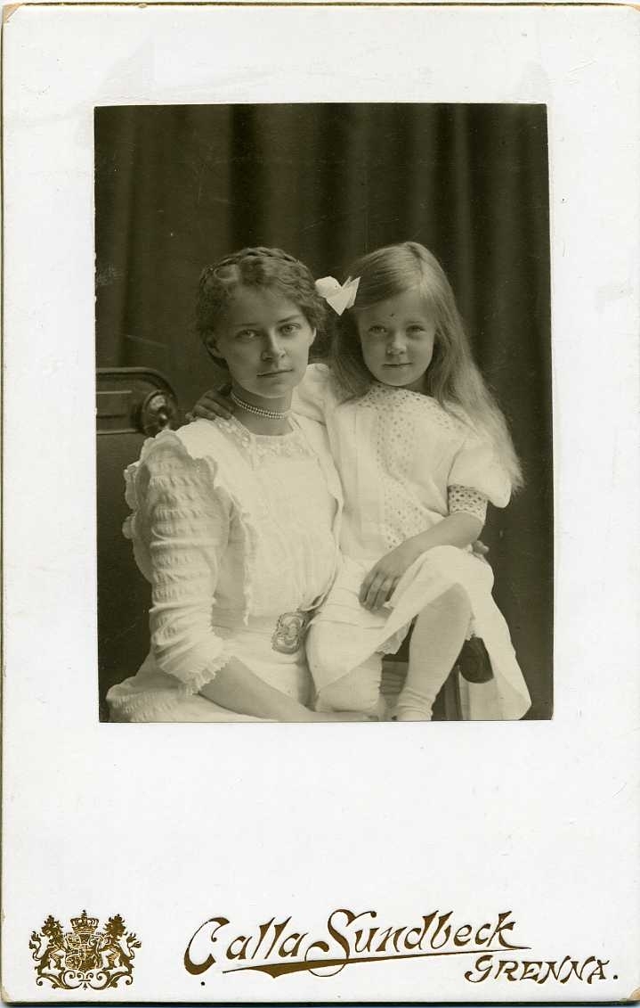 De är klädda i ljus och flickan, med långt hår, har en rosett i håret.