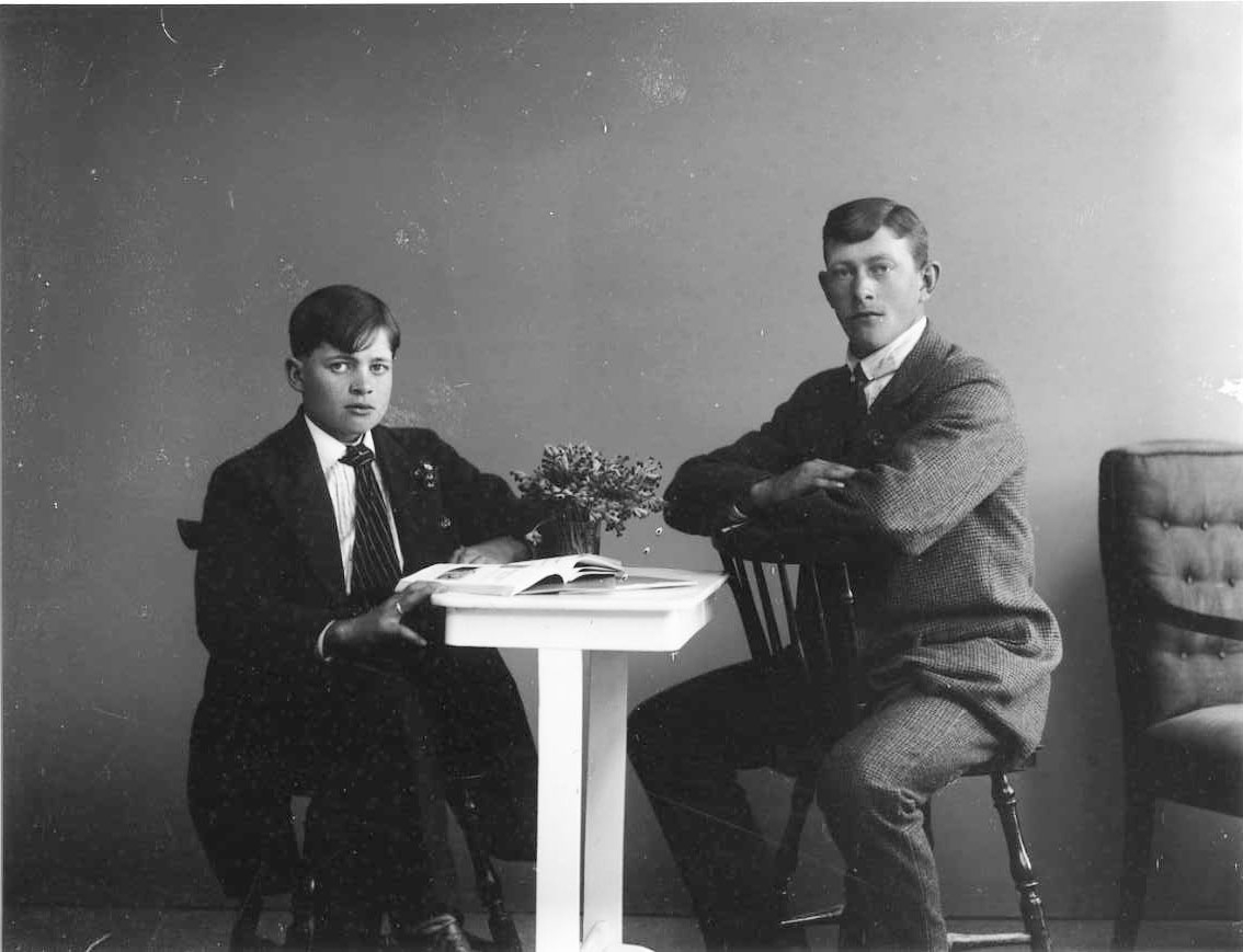 Gruppbild med två unga män sittande vid ett bord, med en uppslagen bok. Sven Blomkvist till vänster med randig slips. Algot Lätt till höger sitter bakvänd på en stol och vilar armarna på dess ryggstöd.