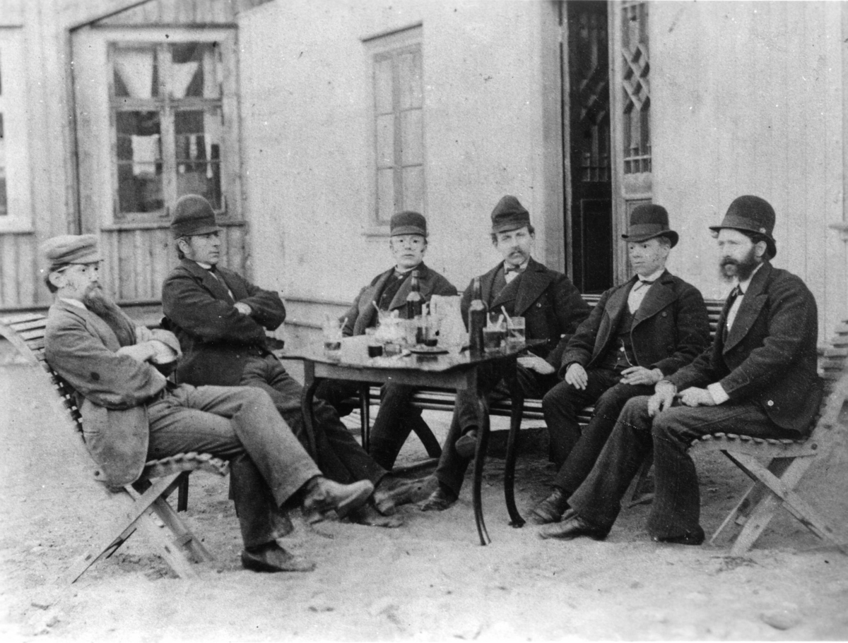 Samling efter S A Andrées landning i Vara. Som fyra från vänster anges S A Andrée och därnäst kronofogde R Molander.