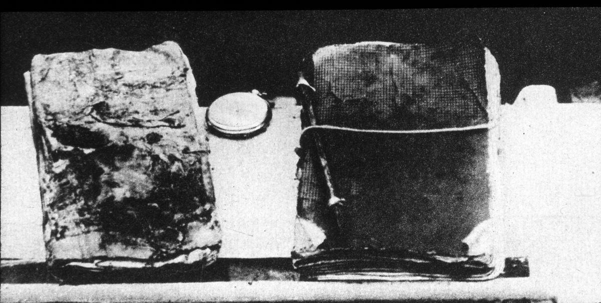 Fynd på Vitön: S A Andrées dagbok, "navigationsbok, blyertspenna och stegräknare. Diapositiv, glas.