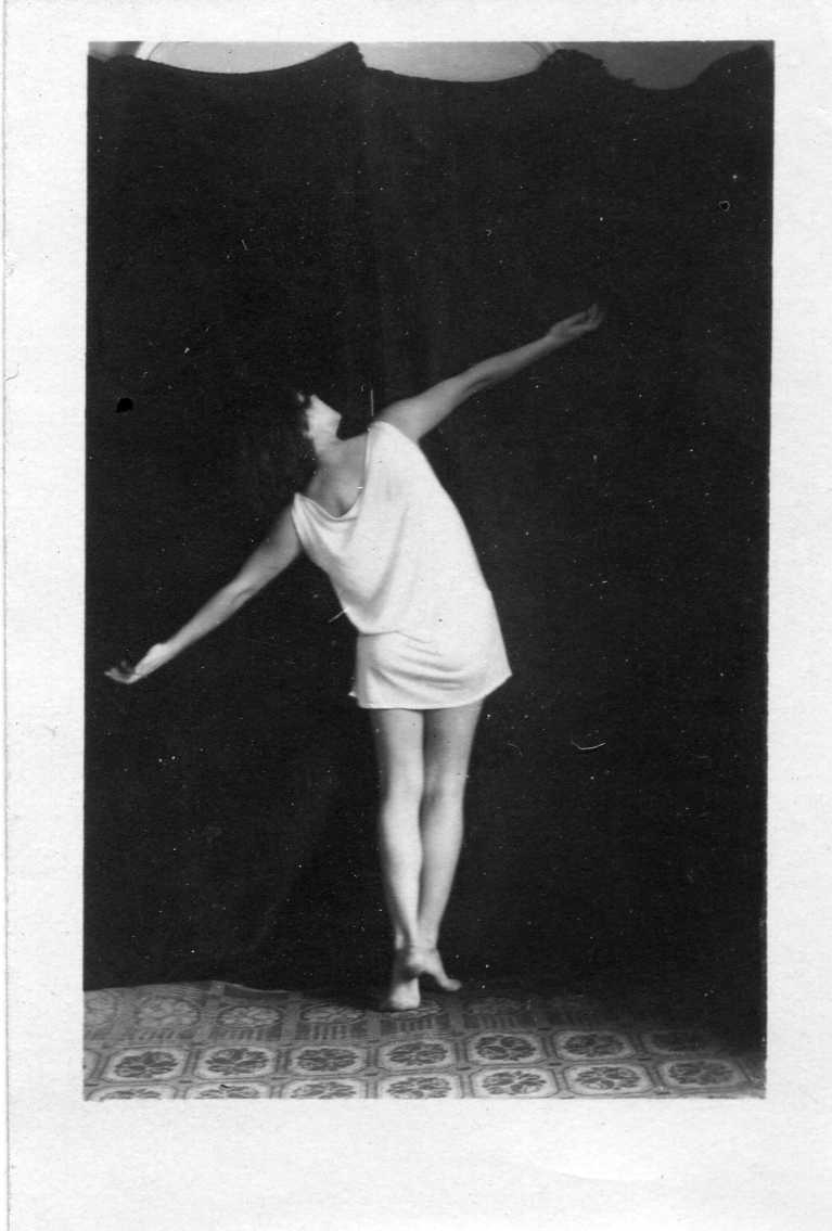 En ung kvinna i en danspose, hon står på ett ben med utsträckta armar i diagonal linje. Fotograferad bakifrån. Hon bär ett ljus ärmlöst linne som slutar strax nedanför underlivet.