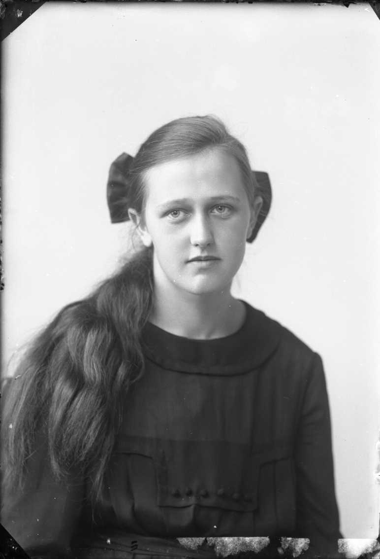 Porträtt av en flicka: Lisa Bolling. Hon sitter och bär en mörk klänning. Mörkt lång hår med en rosett i nacken.