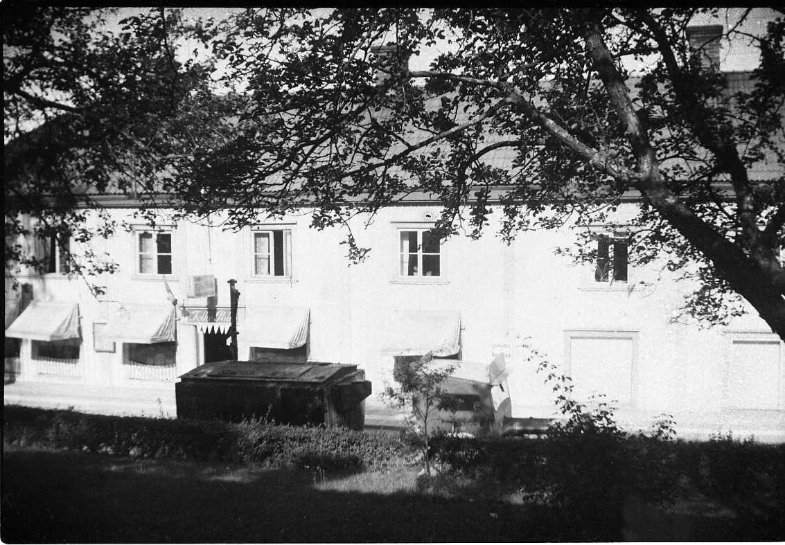 En fastighet på Brahegatan i Gränna, fotograferat mellan träd på motsatta sidan. Skylt för Folke Palms garn- och manufakturaffär. Markiserna är nedfällda på gatuvåningen. En traktor med släp passerar.