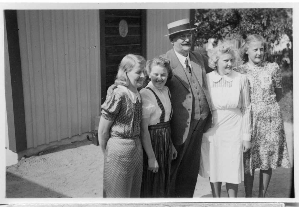 Fabrikör A E Bolling med stråhatt står omgiven av fyra unga kvinnor som arbetar på vandrarhemmet i Gränna.