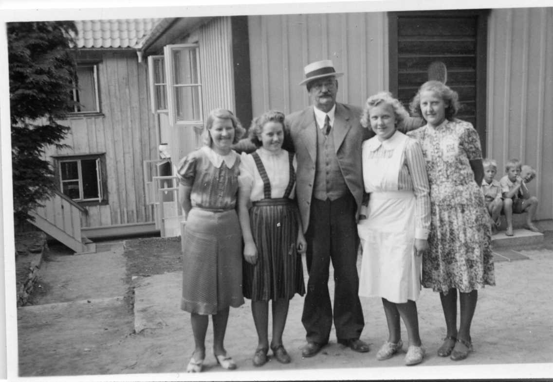Fabrikör A E Bolling med stråhatt står omgiven av fyra unga kvinnor som arbetar på vandrarhemmet i Gränna.