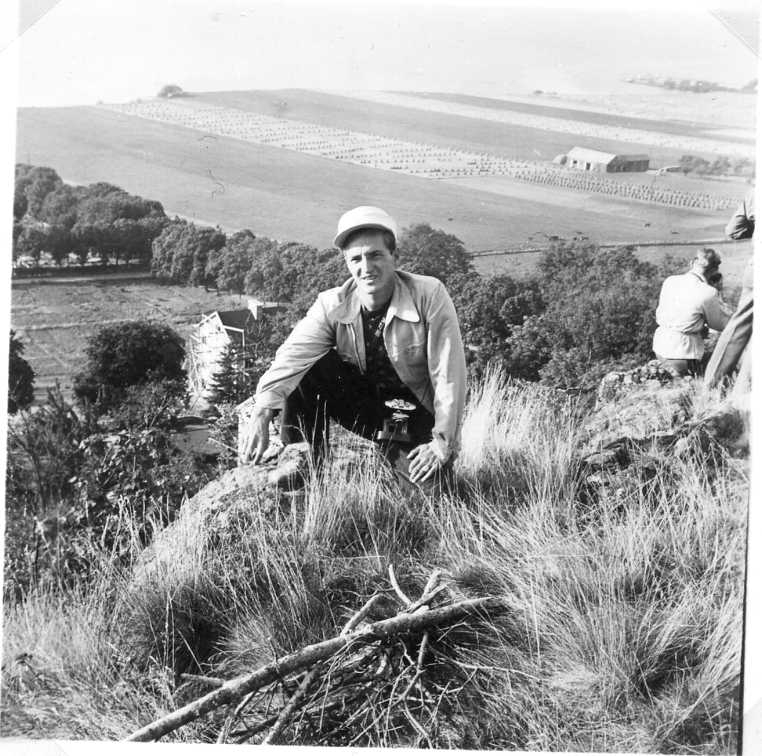 En man sitter på huk på Grännaberget med staden nedanför sig. Till vänster syns kyrkogården och till höger anas skylar på åkern.