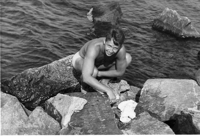 En ung man sitter näck, hukad och skyler sig vänd mot kameran, bland sprängsten vid vatten. Kläder ligger intill. En sten intill med graffiti som liknar: "H G Green, Binghamton NY, USA, Aug 44."