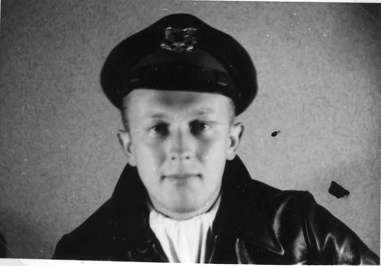 Möjligen H L Gancarz, en ung man i uniform: skinnjacka, scarf och skärmmössa.