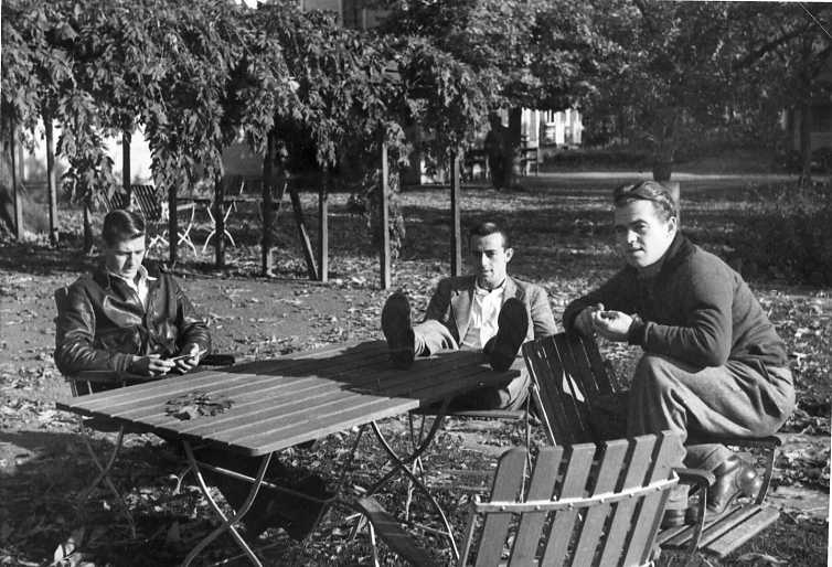 Tre unga män sitter i trädgårdsmöbler i en park. En har skinnjacka på sig, en sitter med fötterna på bordet och den tredje sitter på en stols armstöd.