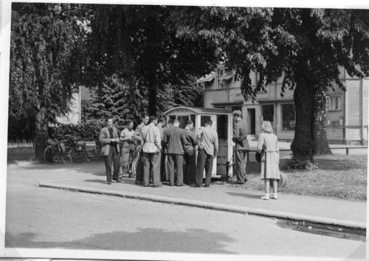 Ett antal män stående vid en glasskiosk på okänd ort. Till höger en militär uniform och en kvinna. I bakgrunden ett trähus med skylt om blanda annat Bok- och pappershandel.
