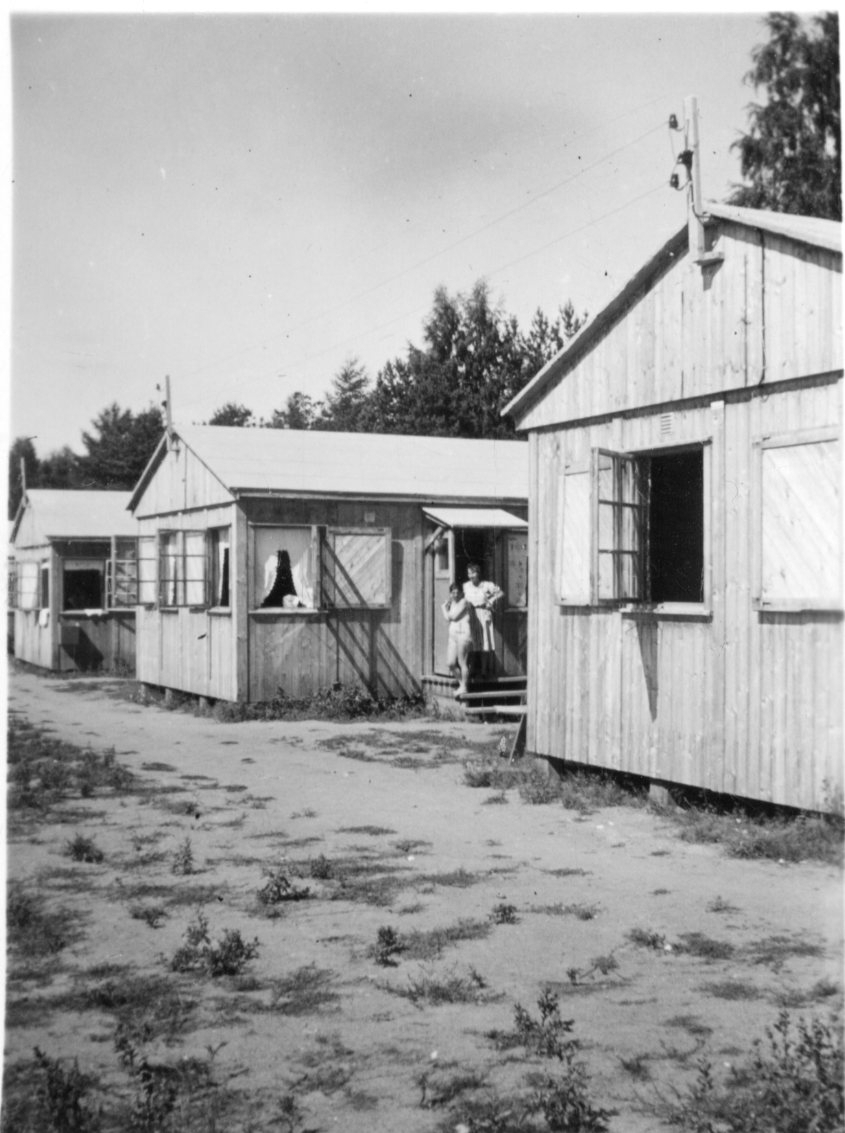 Baracker på rad med gaveln mot fotografen, fönster står öppna, det är sommar. Två kvinnor står på trappan till en barack.
