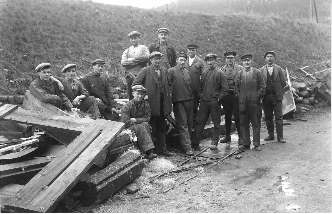 Gruppbild med 13 män i arbetskläder utanför Röttle kraftstation i Gränna. Personal, montörer och andra arbetare. De står och sitter bland en massa virke.