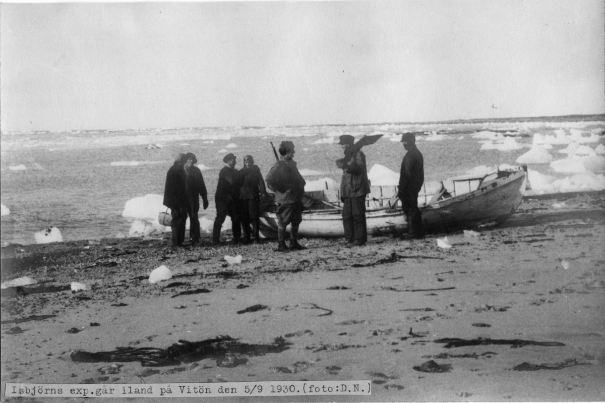 "Isbjörns exp. går iland på Vitön den 5/9 1930." Tvåa fr v Skogvik och därintill troligen Sörensen. Till höger Gudmundsen och i mitten med gevär Stubbendorff.