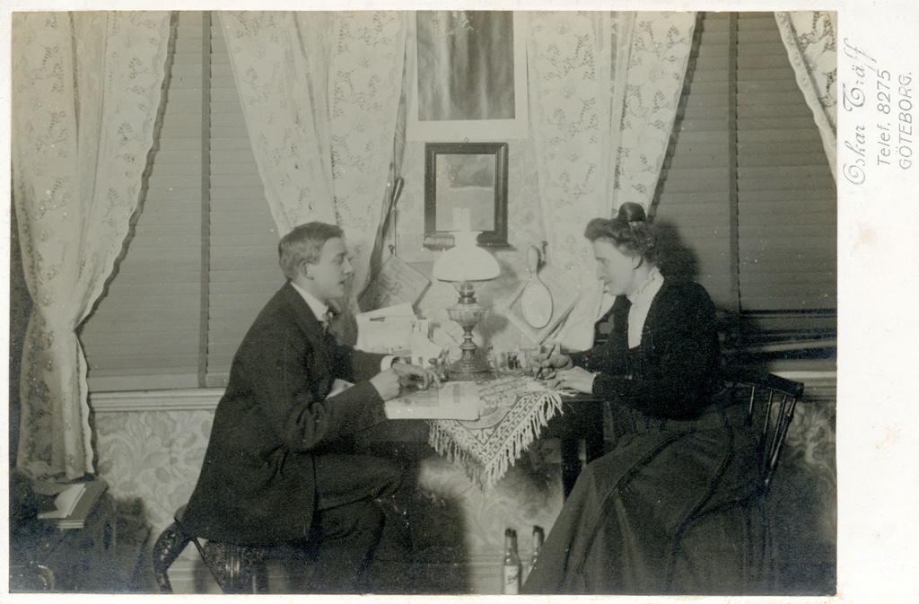 Interiör, Oskar och Mariana Träff sitter vid ett litet bord placerat mellan två fönster. Mariana till vänster skriver och Oskar har en tidning på bordet framför sig. Han verkar säga något till Mariana. På bordet står skrivdon och en fotogenlampa. På golvet under bordet står två flaskor.