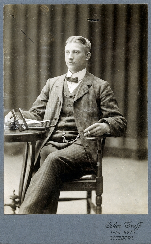 Ateljéporträtt av Oskar Träff. oskar sitter i en stol vid ett litet bord på vilket det ligger ett fotoalbum och står ett inramat fotografi med ett kvinnoporträtt. Oskar har högra handen vilandes i albumet och i vänstra handen håller han en cigarett.