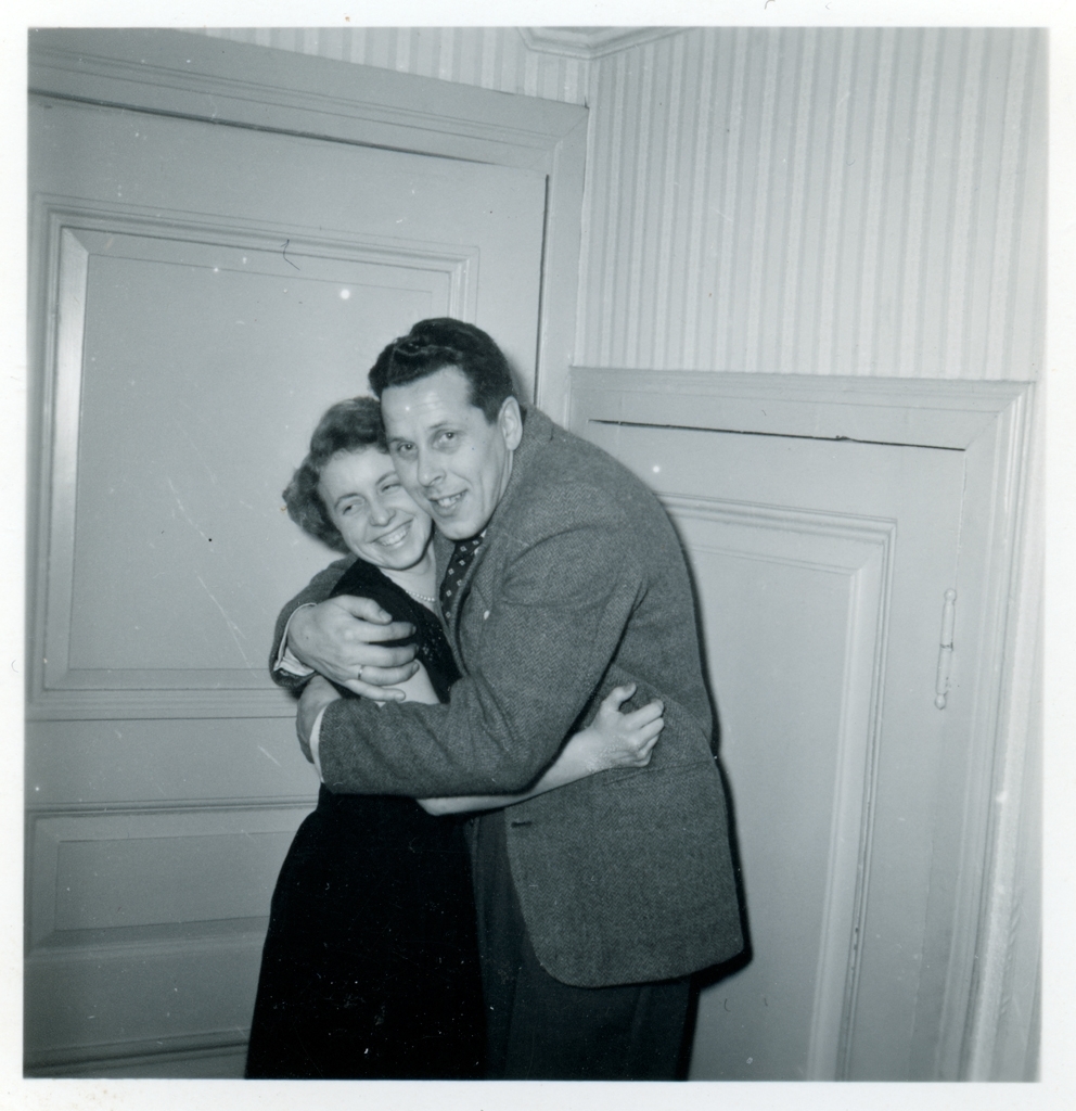 "Brallan" och Rut Andersson(gift med Tage "Tarzan" som också jobbade på verkstaden) står och kramar om varandra. Fotografi från Monarks cykelverkstads personalfest.
