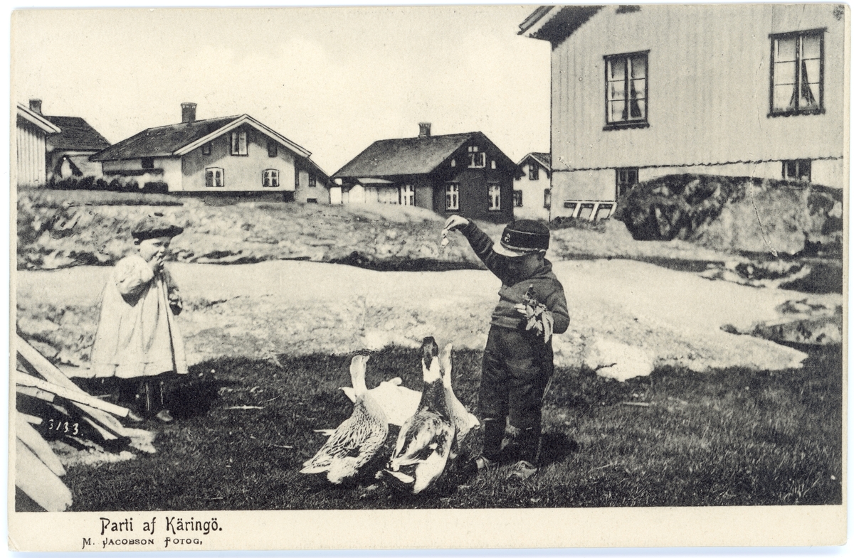 Bröderna Martinus Martinsson och Axel Glader matar gäss.
