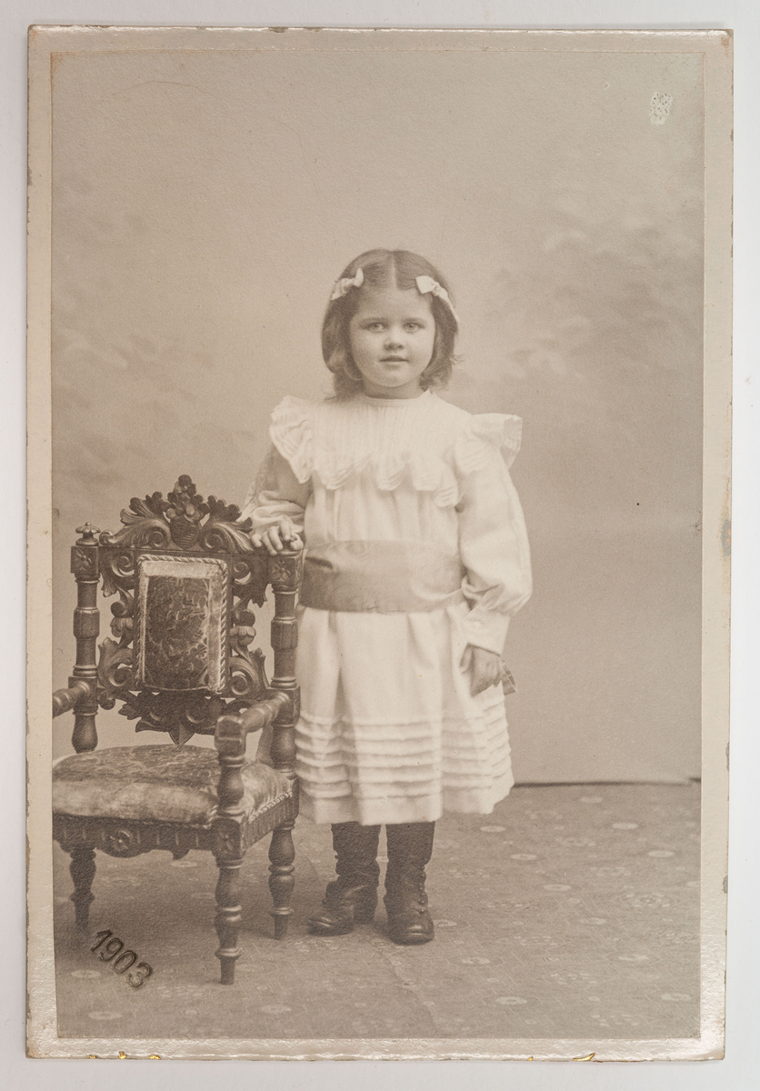 Visitkortsporträtt av Gulli Zachau, 4 år. Fotografiet sitter i fotoalbum som tillhört Gertrud Zachau. Fotografiet sitter på sida 34.