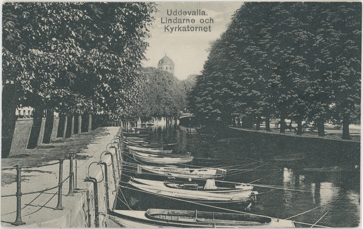 Tryckt text på vykortets framsida "Uddevalla Lindarne och Kyrktornet".