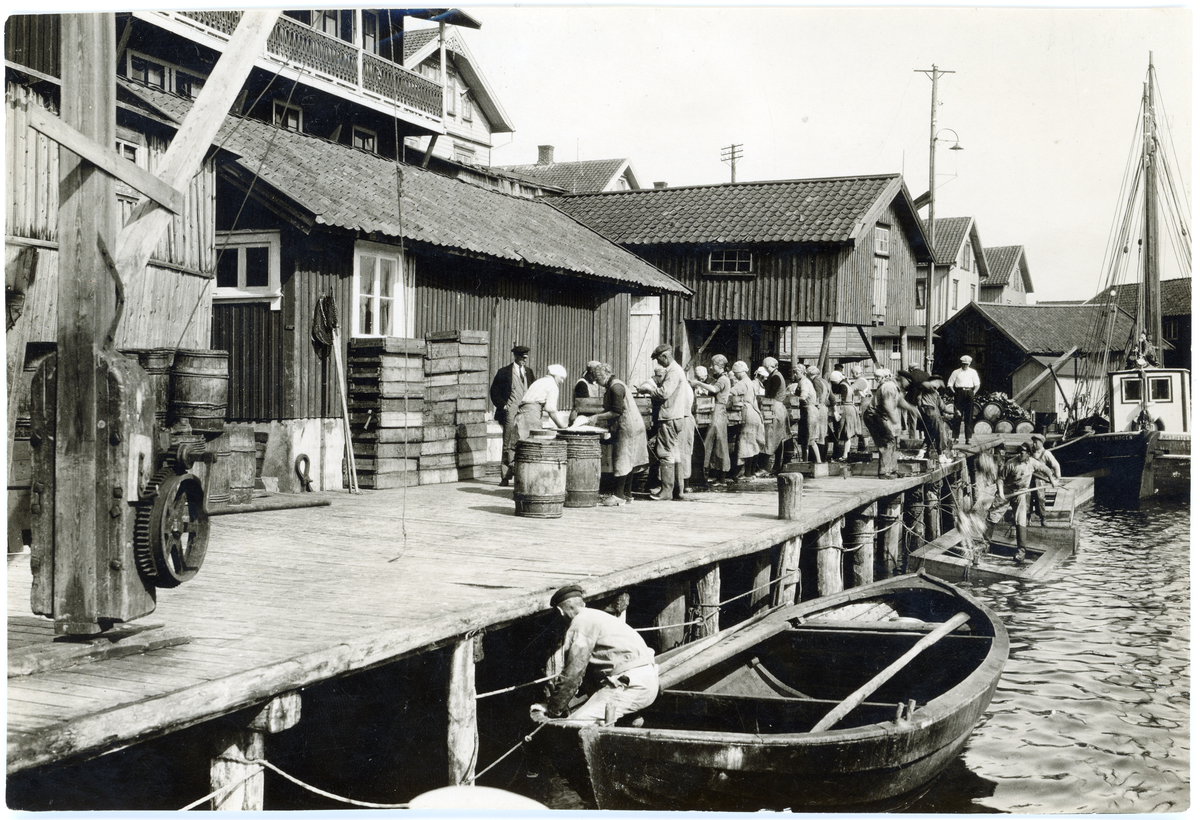 Skrivet på baksidan av fotot: En liten armé av glada fiskarjäntor saltar makrill på en brygga i Smögen.