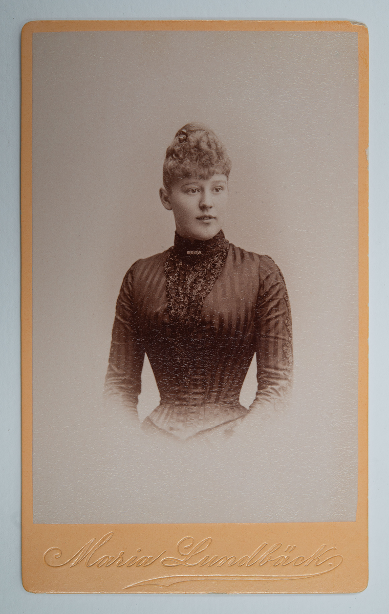 Visitkortsporträtt av okänd kvinna. Fotografiet sitter i fotoalbum som tillhört Gertrud Zachau. Fotografiet sitter på sida 14.