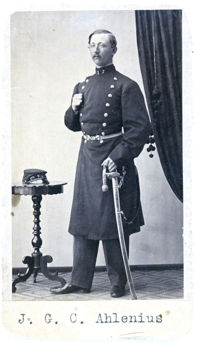 Text på kortets baksida: "Jacob Gabriel Constantin Ahlenius f. 1834. (Bohuslän). Kapten för Bullarens kompani Mölnebacka i Krokstads socken".