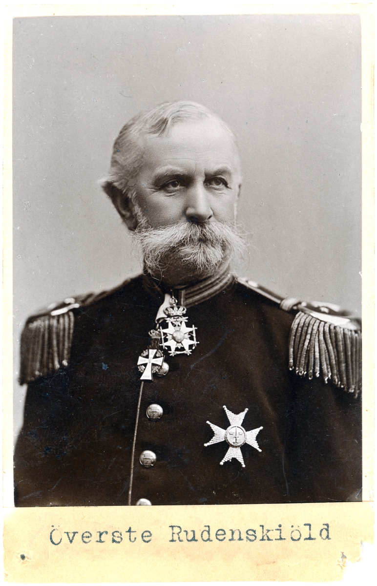 Text på kortets baksida: "Överste Axel Rudenskiöld f. 1829 d. 1914. Chef Boh. reg. T. f. 1882-1885. Chef 1885-1890".