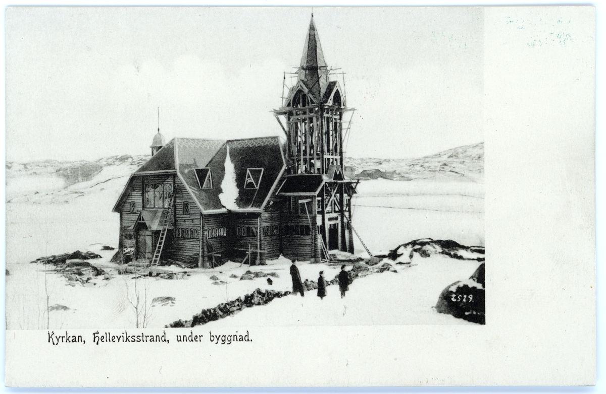Tryckt text på kortet: "Kyrkan, Hälleviksstrand, under byggnad."
