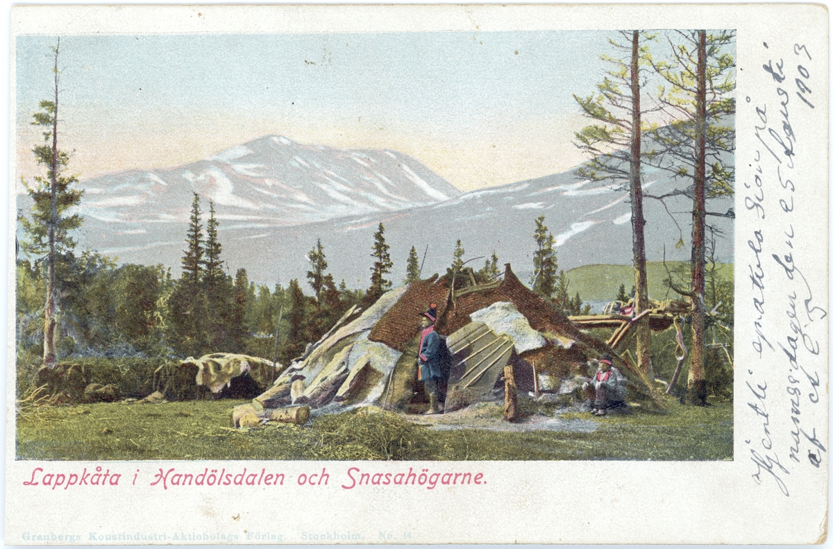 Notering på kortet: Lappkåta i Handölsdalen och Snasahögarna.