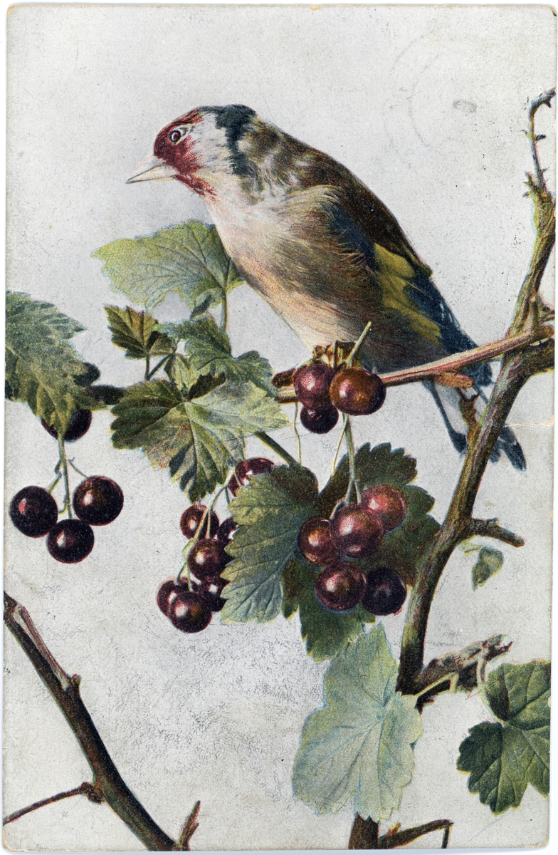 Kort. Steglits som sitter på en gren med svarta vinbär.