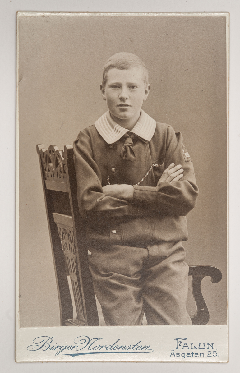 Visitkortsporträtt av Hilma Thorells och Landsfiskal Thorells son, Gunnar Thorell, 13 år. Fotografiet sitter i fotoalbum som tillhört Gertrud Zachau. Fotografiet sitter på sida 27.