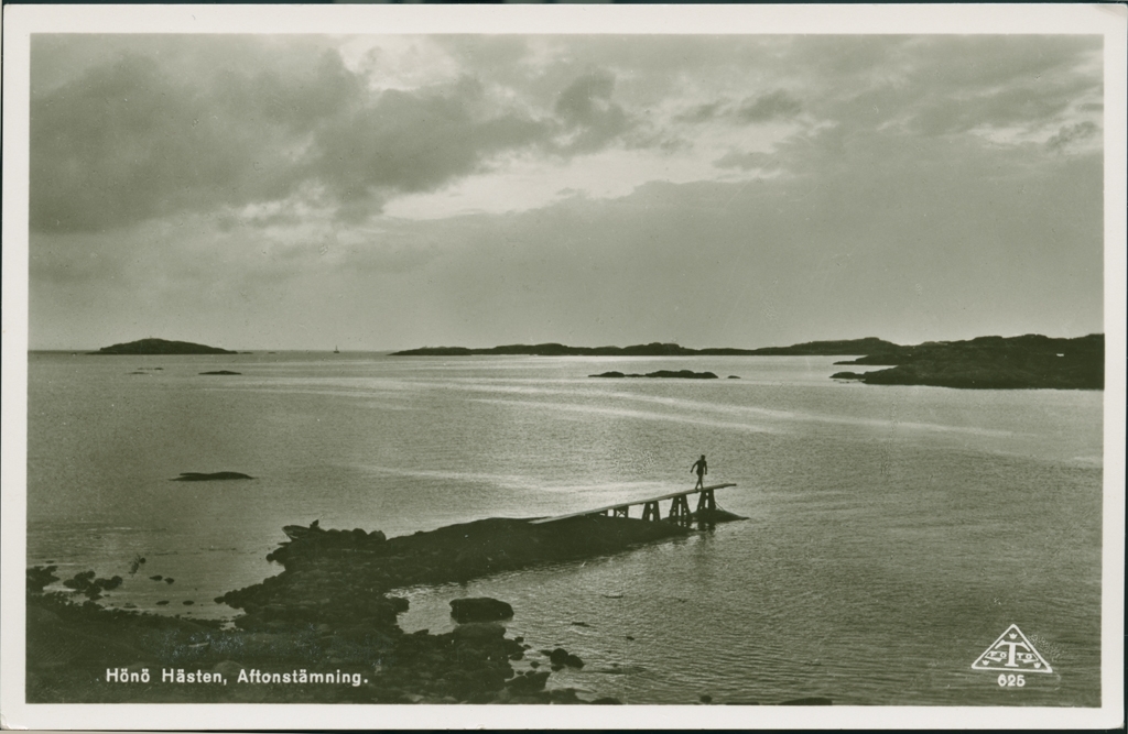 Vykort med motiv från Hönö Hästen. Fotografiet är taget från land ut över en strand och det omkringliggande skärgårdslandskapet. På en brygga ut i vattnet går en person ut mot vattnet.