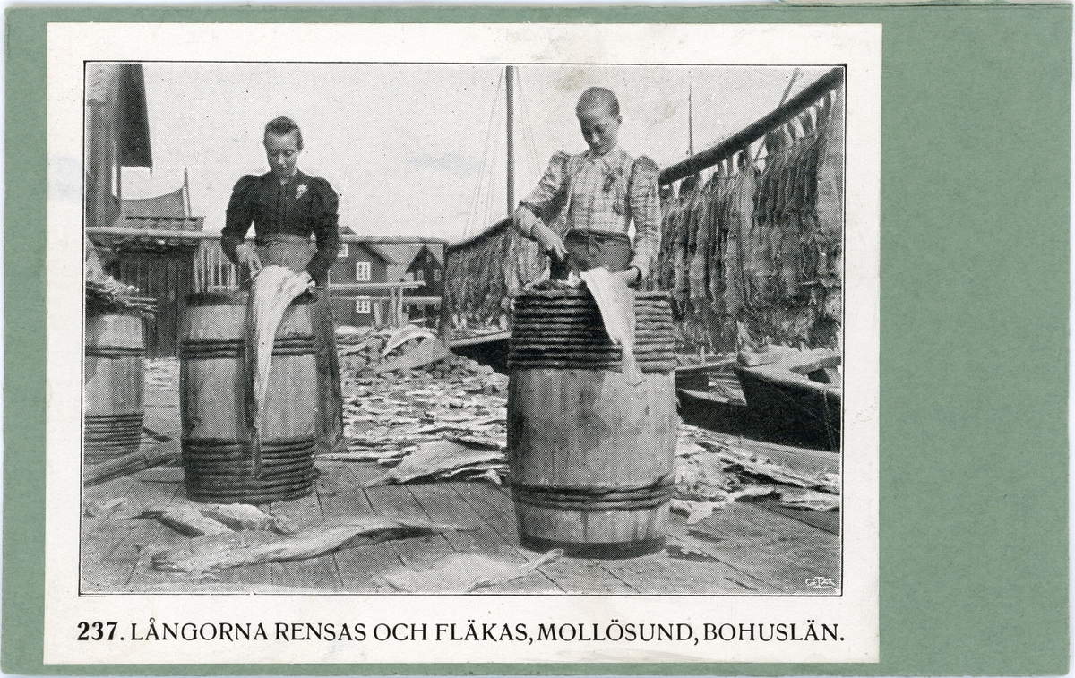 Tryckt text på kortet: "237. Långorna rensas och fläkas, Mollösund, Bohuslän."