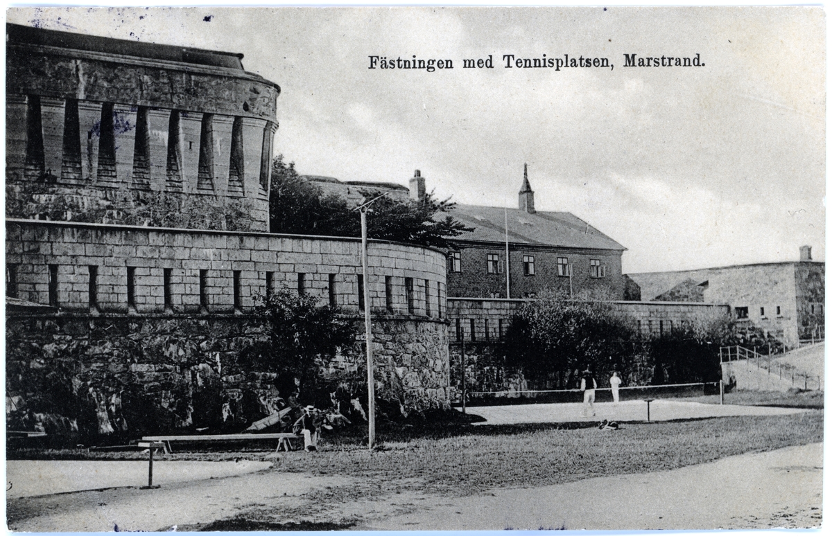 Tryckt text på kortet: "Fästningen med Tennisplatsen, Marstrand."