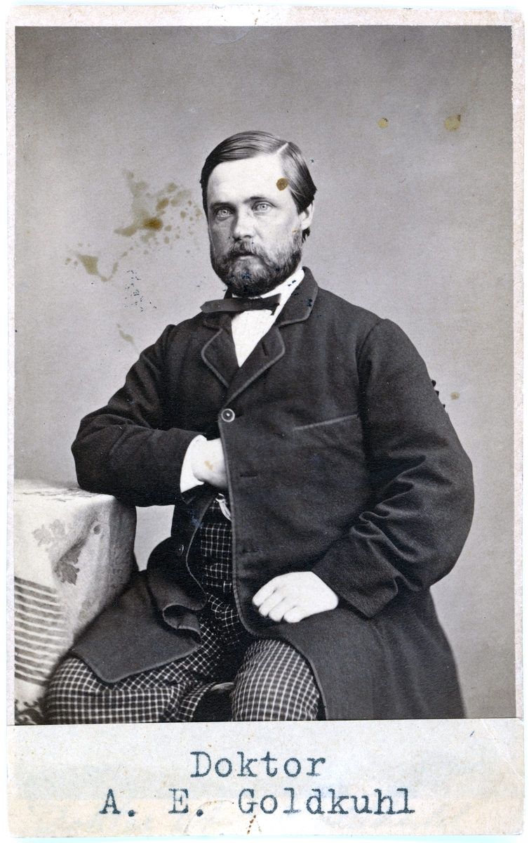 Text på kortets baksida: "Provincialläkaren Dr, August Edvard Goldkuhl. F. 1983 Sandklef. Utn. 1869 till läkare vid Kronob. Läns Laz Wäxsjö".