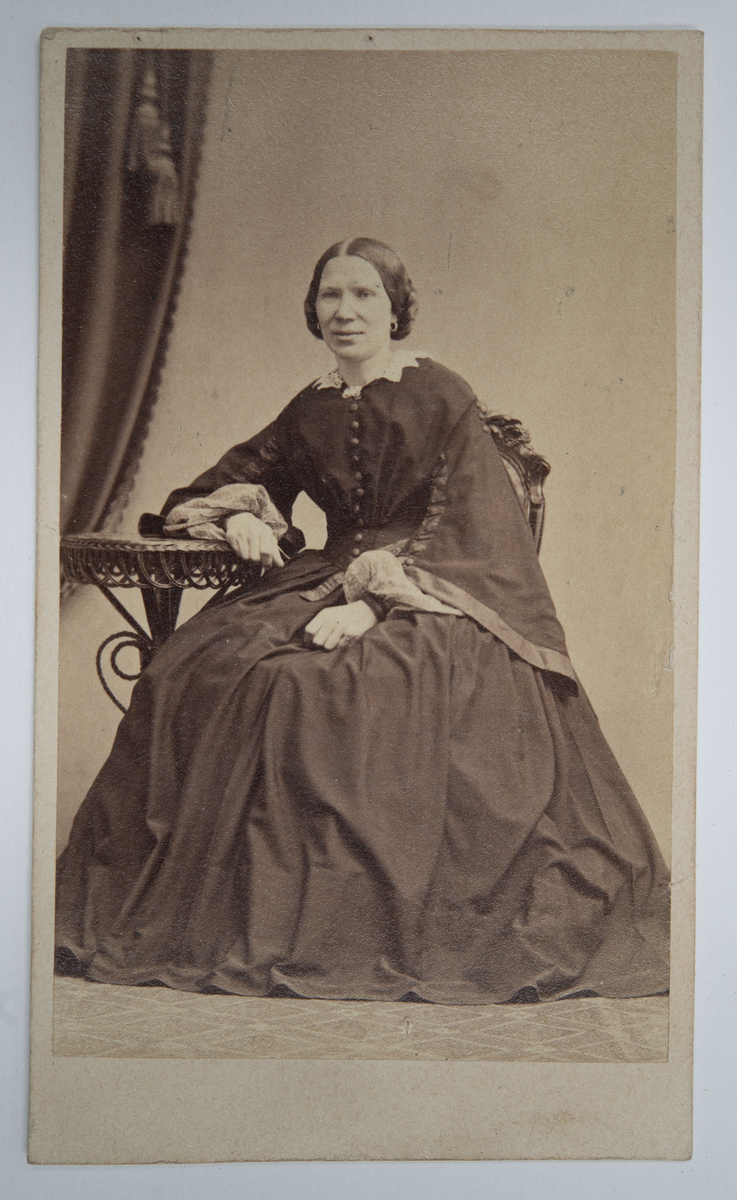 Visitkortsporträtt av Christina Zachau. Fotografiet sitter i fotoalbum som tillhört Gertrud Zachau.