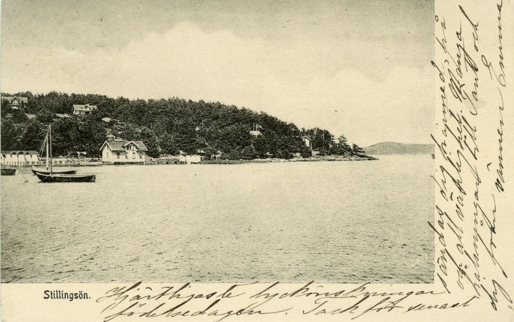 Enligt Bengt Lundins noteringar: "Stillingsön. Utsikt mot badhusen och Strandanäs"