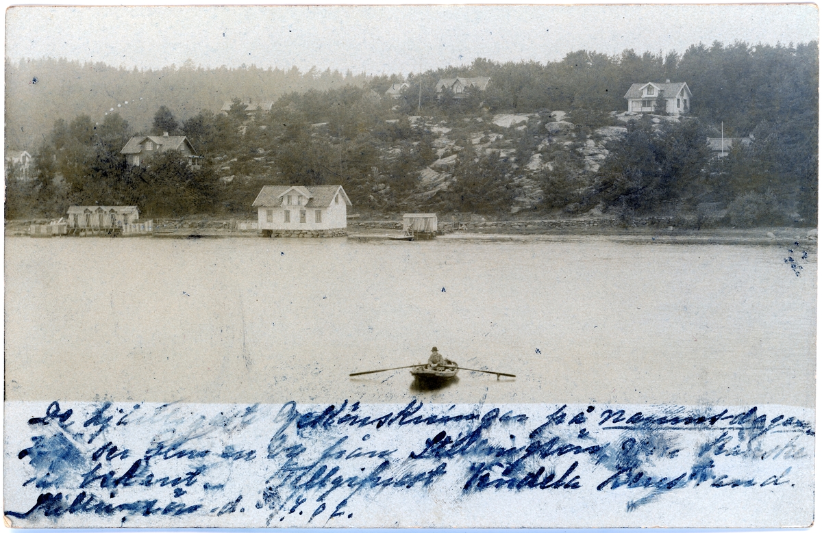 Enligt Bengt Lundins noteringar: "Stillingsön. Badhusen och villorna bakom samt roddbåt"