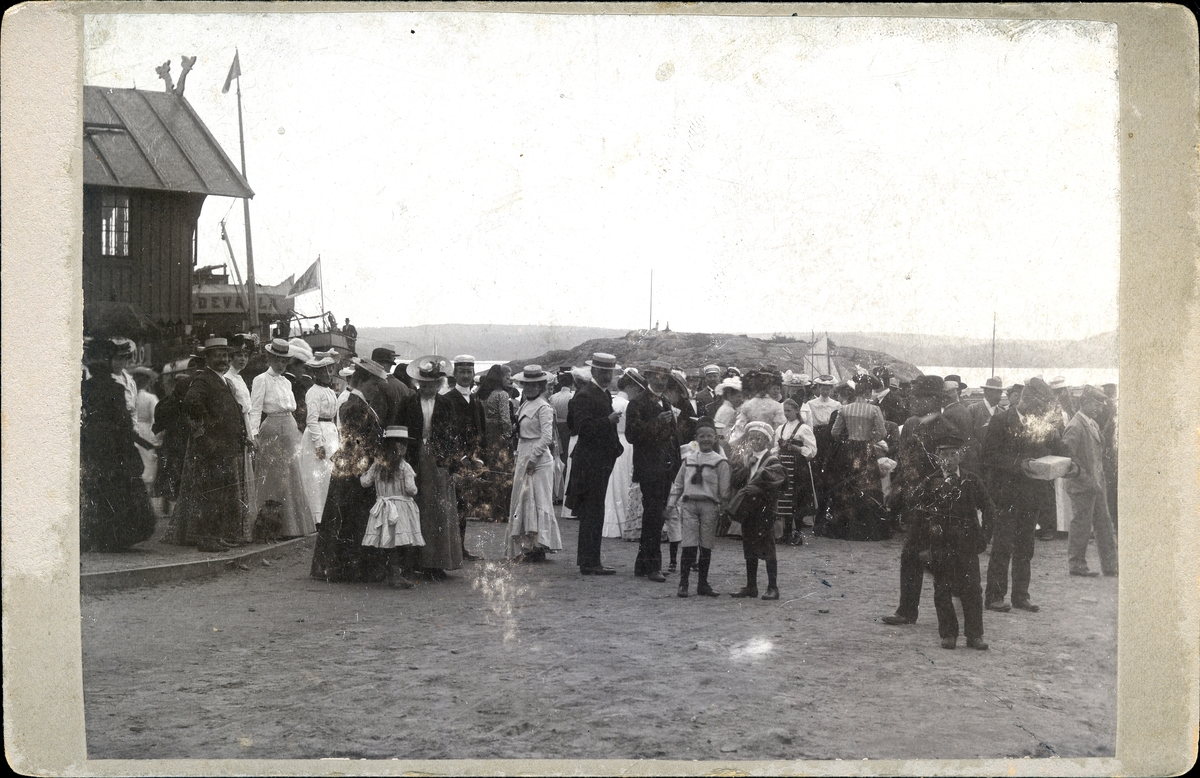 Folksamling i Lyckornas hamn med klocktornet och ångaren Uddevalla till vänster