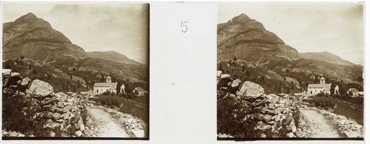 Sterobild med naturmotiv från Pyreneerna. Kyrka invid berg.