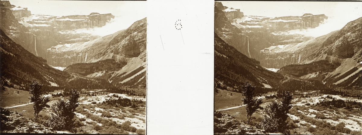 Sterobild med naturmotiv från Pyreneerna. Dal med berg och glaciär i bakgrunden.