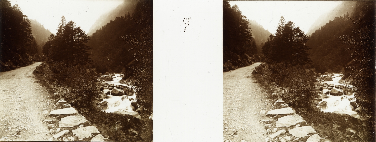 Sterobild med naturmotiv från Pyreneerna. Väg invid bäck.
