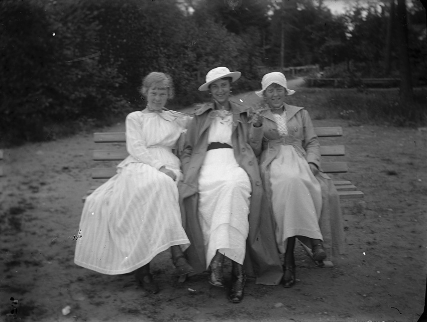 Tre kvinnor sittande på en parkbänk. Ryd, Småland.