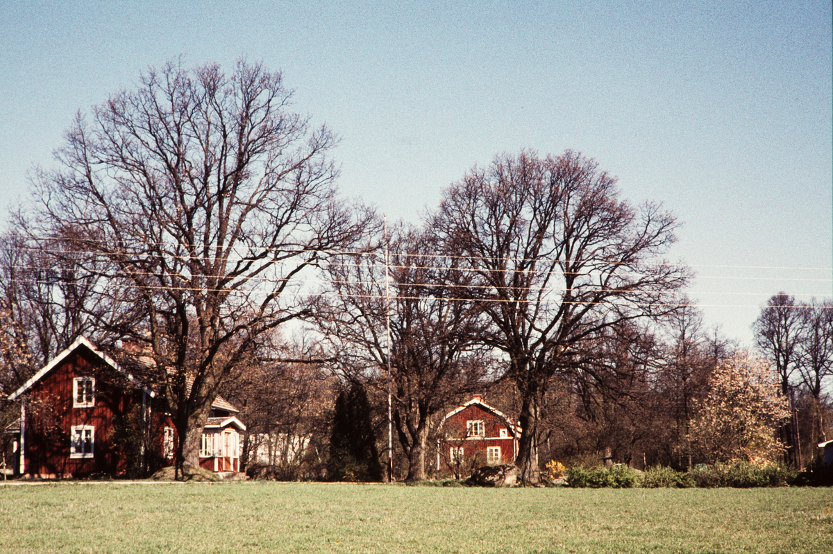 Två bostadshus på Huseby, våren 1960. Mellan husen syns en flaggstång.